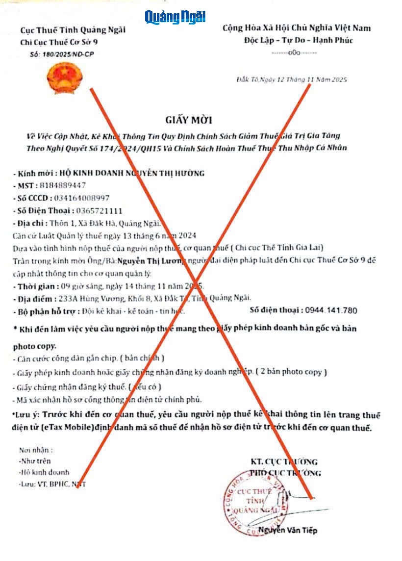 CHIÊU TRÒ MỚINhững ngày gần đây, nhiều hộ kinh doanh trên địa bàn tỉnh liên tục nhận được giấy mời có đóng dấu đỏ, được cho là của cơ quan thuế, liên quan đến chính sách giảm thuế giá trị gia tăng và hoàn thuế thu nhập cá nhân. Đây là hình thức, chiêu trò lừa đảo mới trên không gian mạng, đánh vào tâm lý tin tưởng các văn bản hành chính của người dân.
