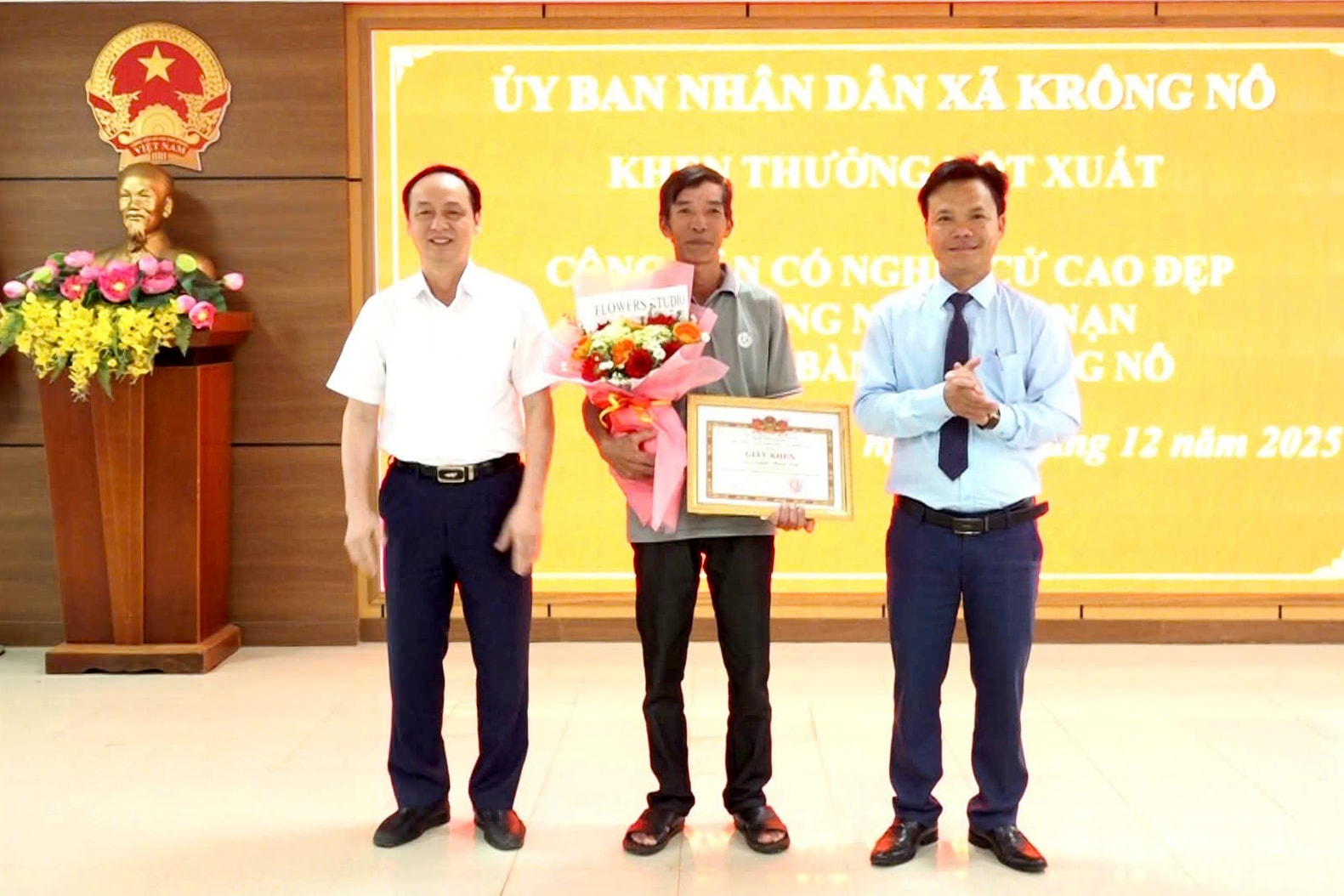 Ghi nhận tinh thần quả cảm và hành động nhân văn, Chủ tịch UBND xã Krông Nô đã tặng giấy khen đột xuất cho ông Nguyễn Thành Vinh. Chính quyền địa phương nhấn mạnh đây là tấm gương tiêu biểu cần được lan tỏa để khuyến khích tinh thần trách nhiệm cộng đồng.